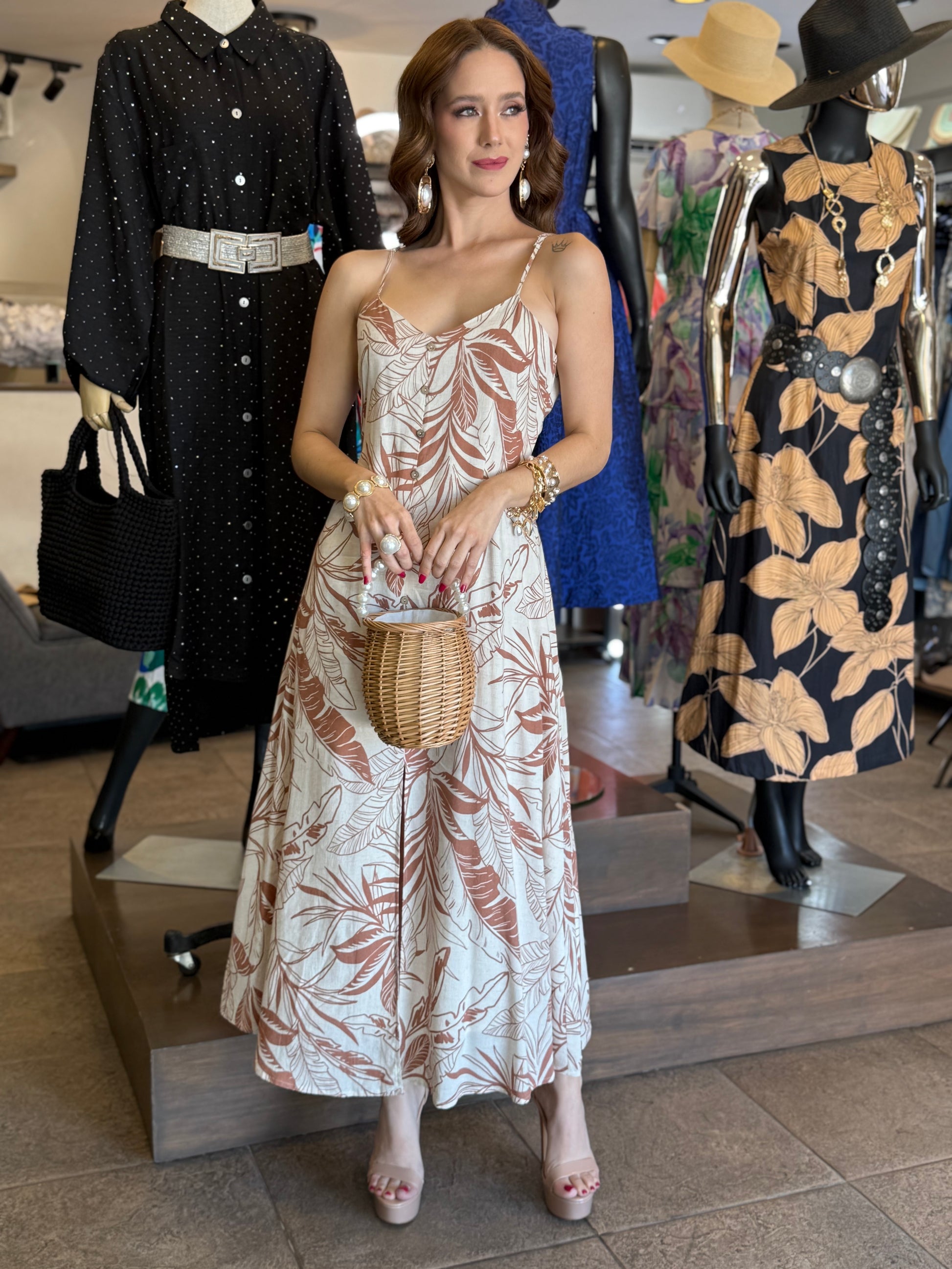 Un vestido que abraza la esencia del otoño con elegancia natural. Su estampado de hojas en tonos terracota sobre fondo marfil evoca la suavidad de la temporada, donde cada detalle transmite calidez y sutileza. Los tirantes finos y el escote en V realzan la feminidad con delicadeza, mientras su falda fluida con abertura frontal se mueve al compás del viento otoñal.