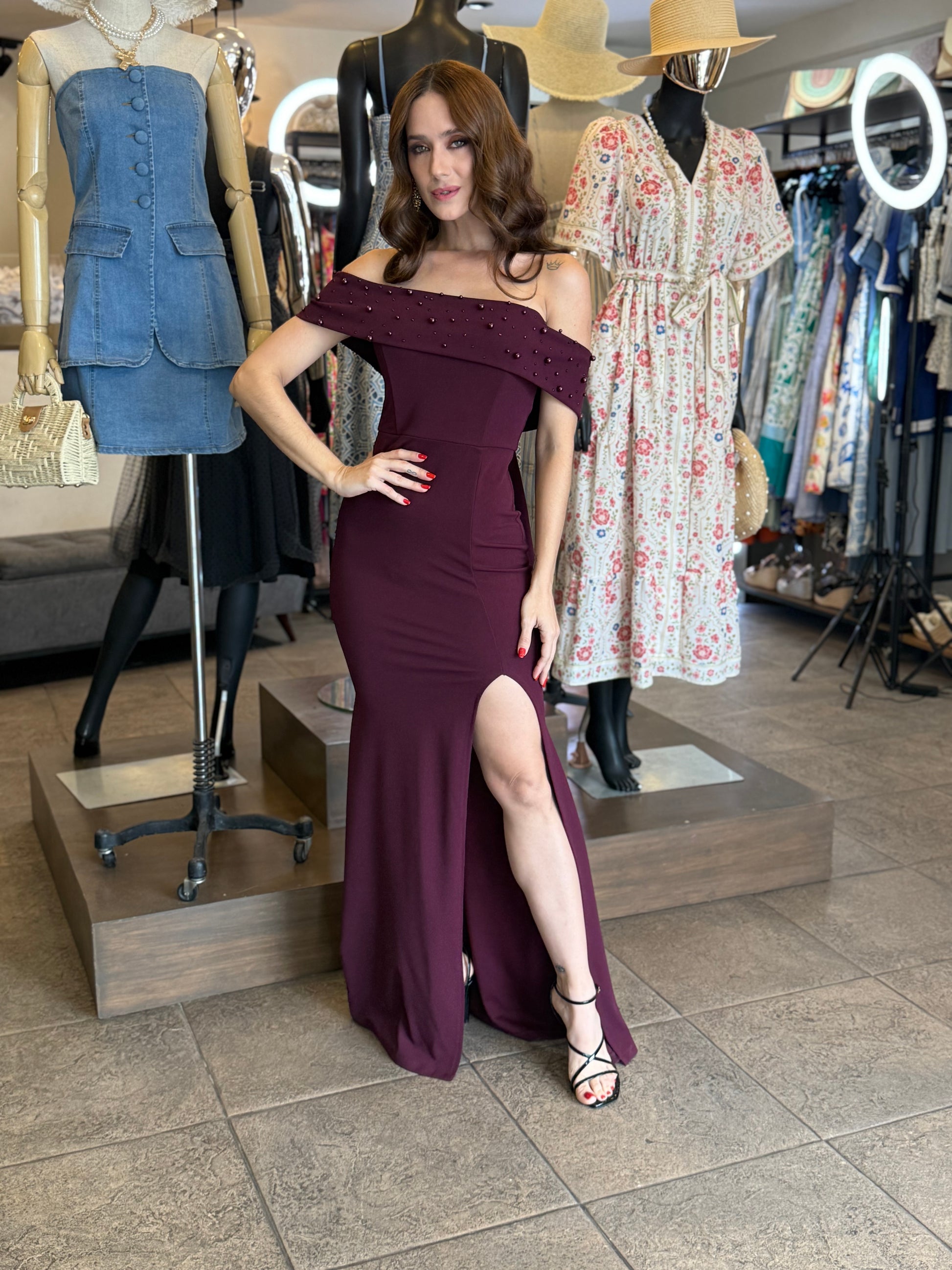 Un vestido largo que redefine la sofisticación. Con escote off shoulder adornado con aplicaciones delicadas que aportan brillo sutil, se ajusta a la silueta realzando las curvas con distinción. La abertura lateral en la falda aporta un aire sensual y moderno, equilibrando a la perfección la sobriedad de su tono borgoña con un toque atrevido.