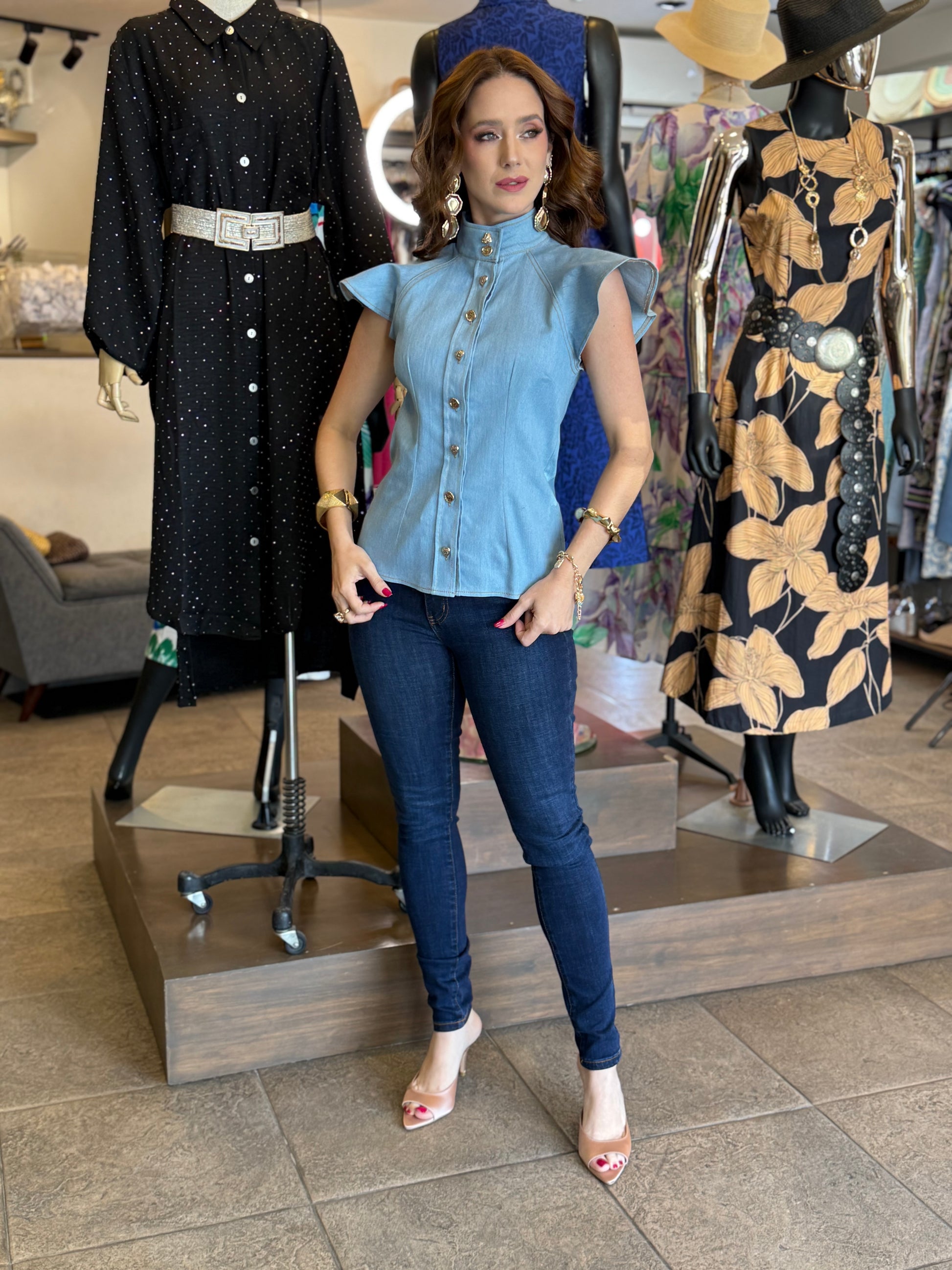 Una blusa de mezclilla con un aire sofisticado y vanguardista que transforma lo casual en chic. Su diseño estructurado resalta con un cuello alto de botones dorados que recorren al frente, aportando un toque de modernidad y elegancia. Las mangas con volumen ligero y caída angular crean un efecto estilizado y único, ideal para marcar la diferencia en cualquier ocasión.