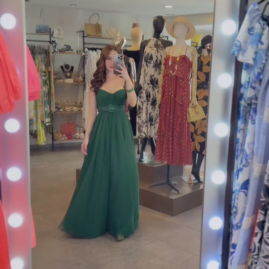 Un vestido que deslumbra por su elegancia atemporal y su corte sofisticado. El tono verde esmeralda evoca la riqueza del otoño y se convierte en la elección perfecta para una ocasión especial.