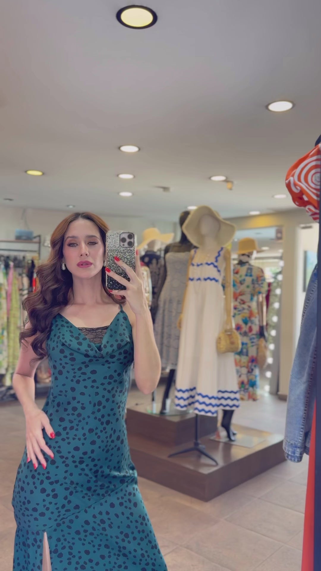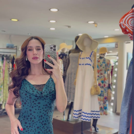 Un vestido que destaca por su sofisticación con un toque atrevido. Confeccionado en satín verde esmeralda, su silueta slip se desliza con fluidez sobre la piel, mientras que el escote drapeado aporta suavidad y feminidad. El estampado animal print en negro le da un aire audaz y moderno, y la abertura lateral añade sensualidad a cada paso.