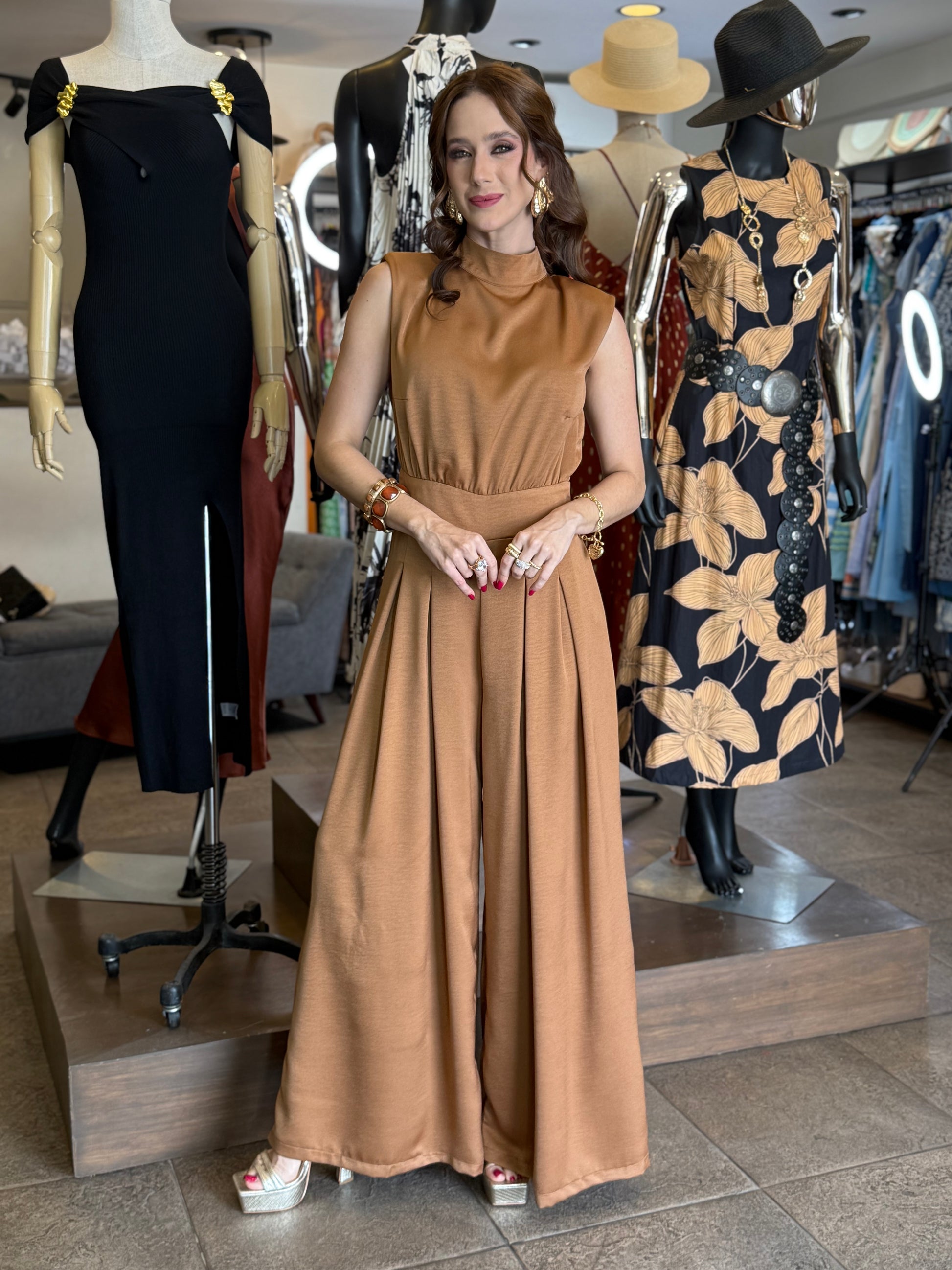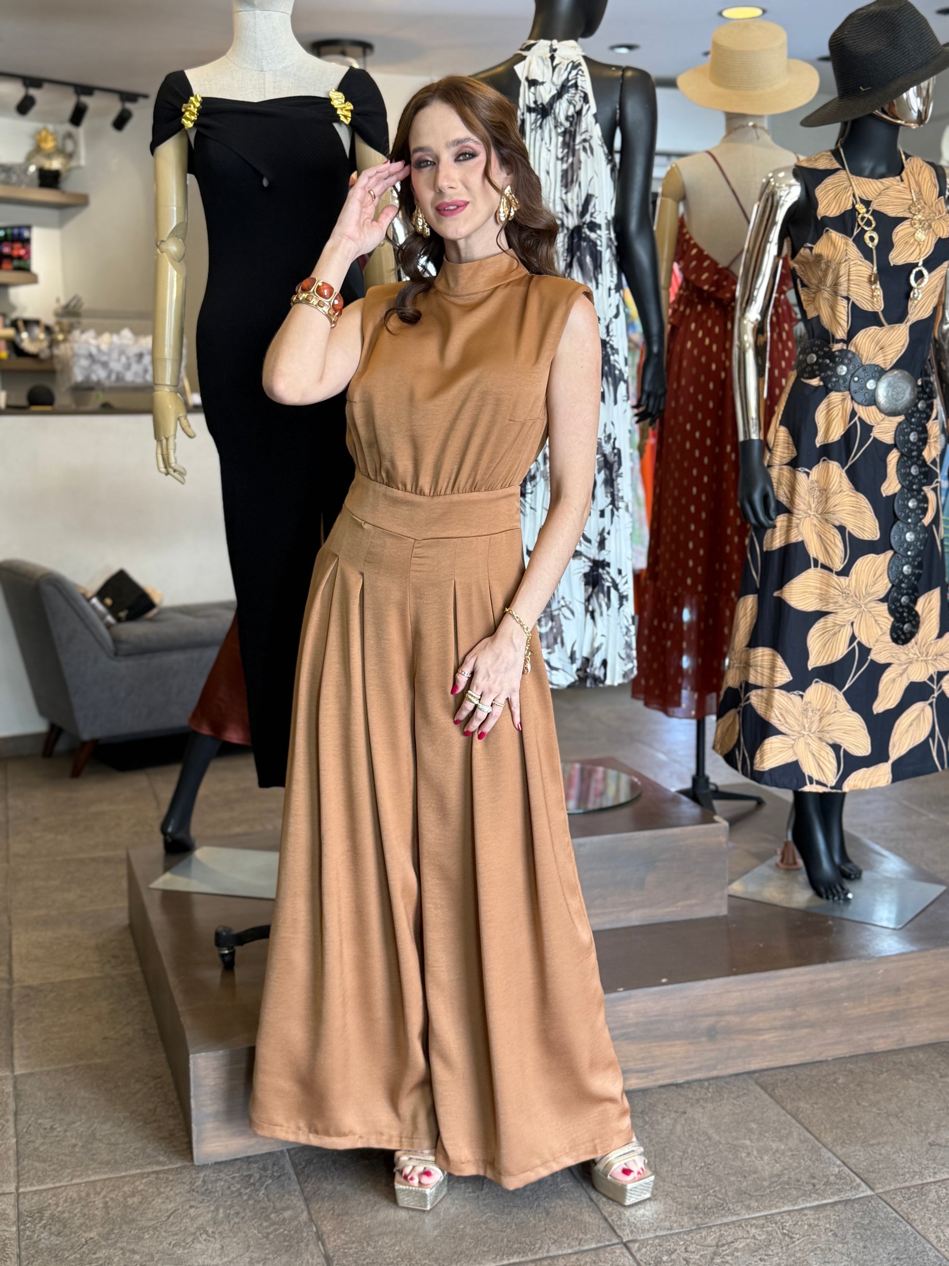 Palazzo en tono camel con caída amplia y fluida que estiliza la silueta y aporta un aire sofisticado. Su diseño de talle alto alarga visualmente la figura, mientras que el tejido suave realza la elegancia y comodidad. Perfecto para un look de día glamuroso o una salida nocturna con un toque distinguido.