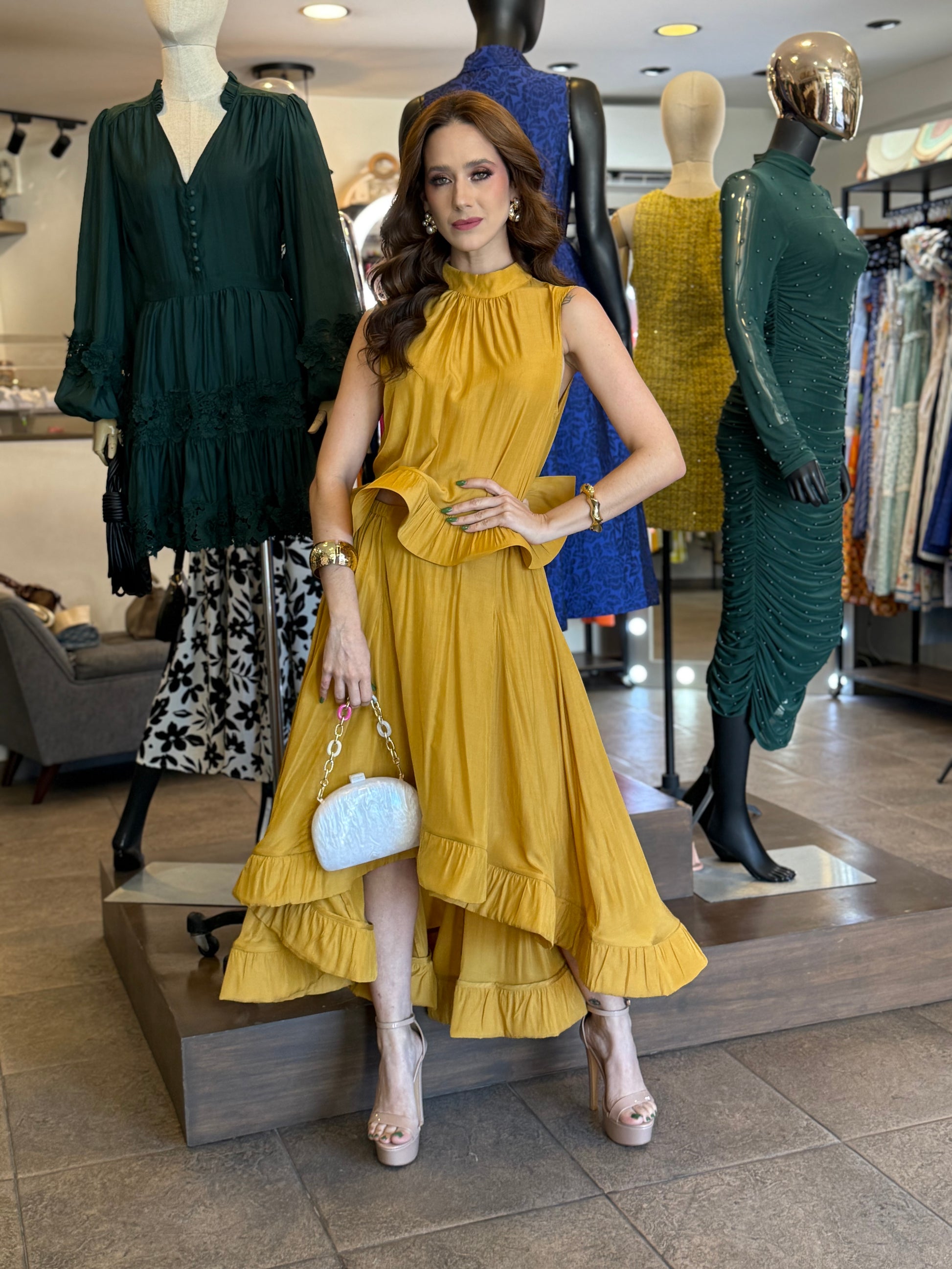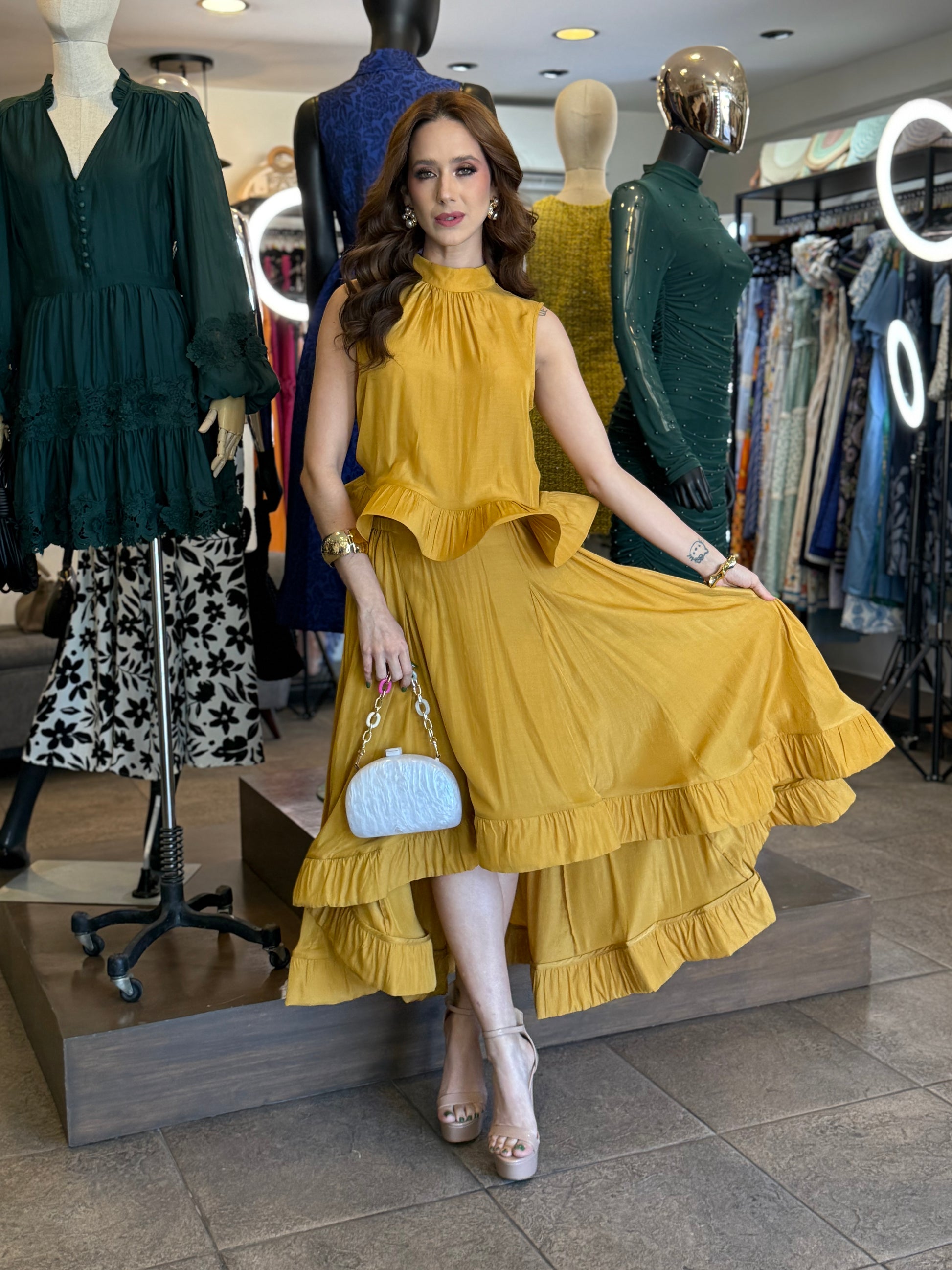 Un conjunto que irradia calidez y elegancia, inspirado en los tonos dorados del atardecer otoñal. Su diseño fluido con volantes suaves y cuello halter crea una silueta femenina y luminosa que se mueve con gracia en cada paso. El top y la falda se equilibran entre sofisticación y frescura, ofreciendo un look versátil para eventos de día o tardes con encanto.