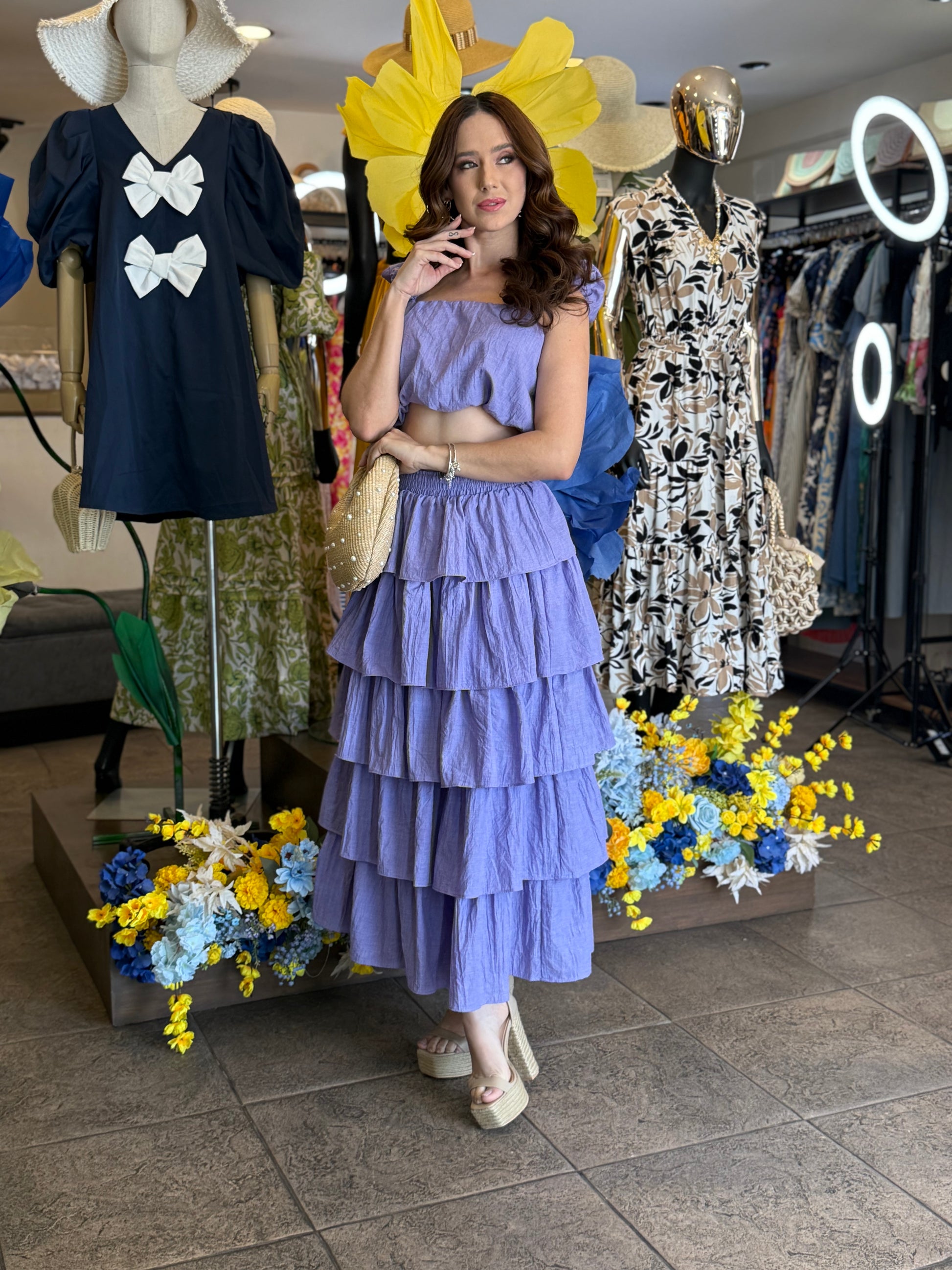 Conjunto de dos piezas en tono lila suave. Top ajustado y falda con caída fluida que estiliza la silueta. Ligero, cómodo y fácil de combinar para looks femeninos y modernos.