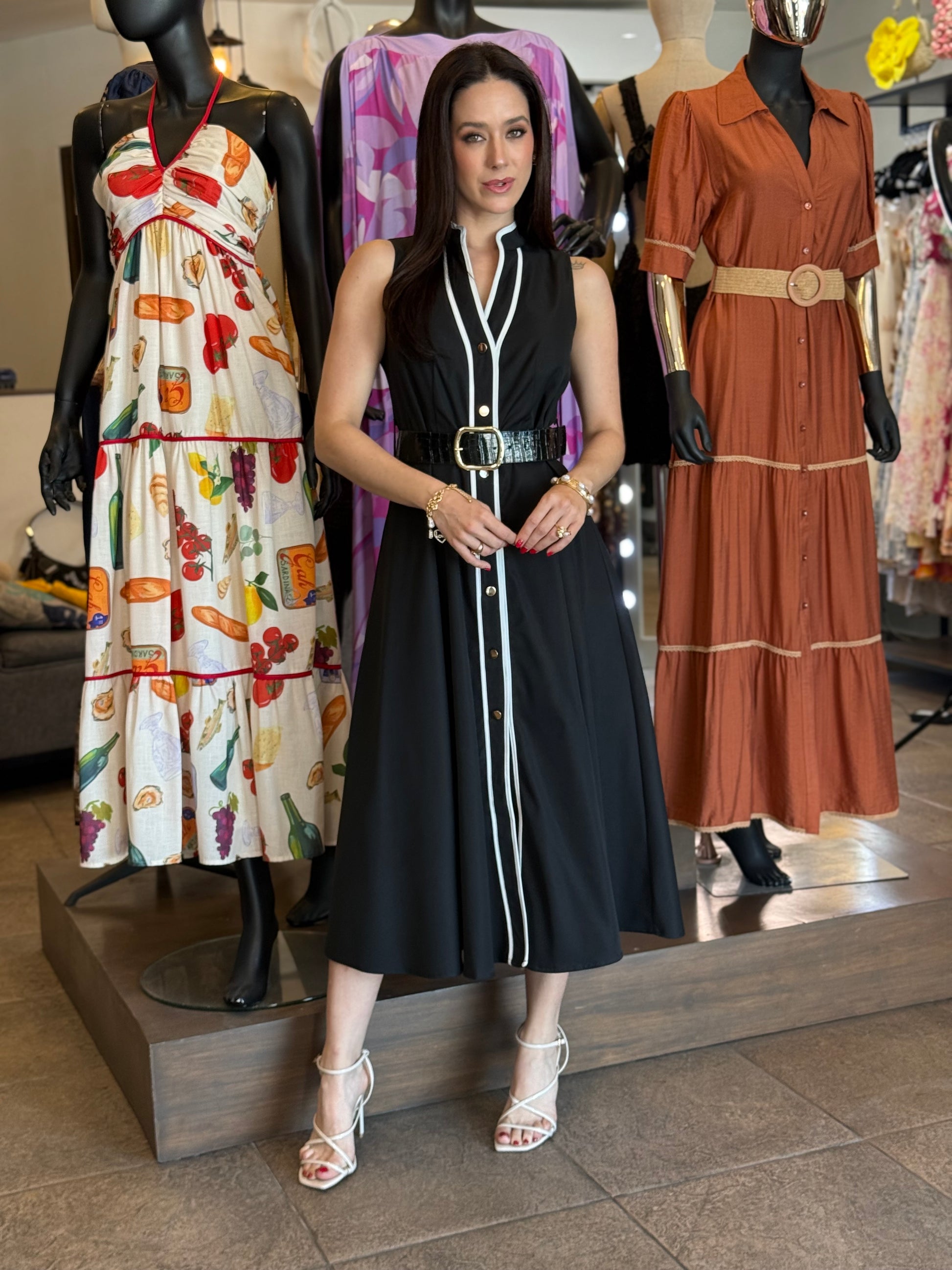 Un vestido que equilibra sobriedad y sofisticación con un diseño impecable. En negro profundo con vivos en contraste blanco que recorren el escote y el frente, esta pieza redefine la elegancia clásica con un toque moderno.