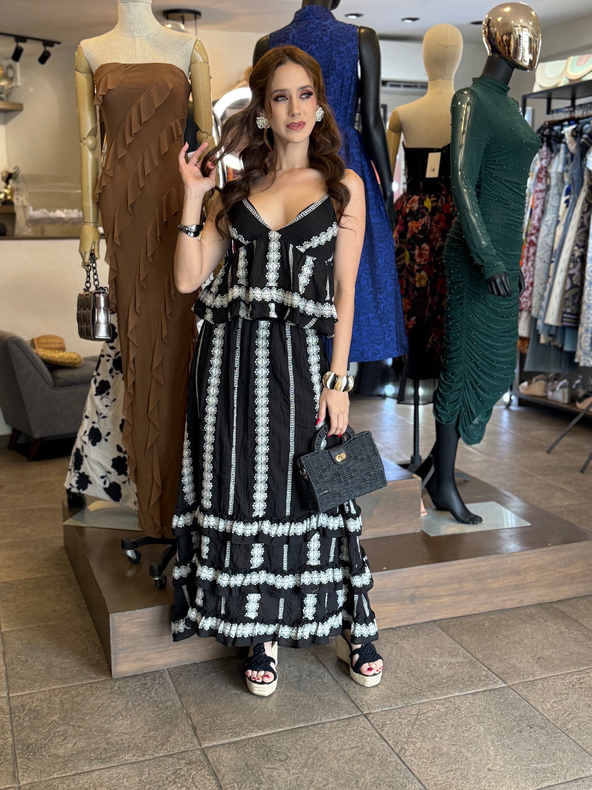 Conjunto de dos piezas compuesto por blusa y falda larga en tono negro con delicados bordados en contraste que recorren la prenda verticalmente, creando un efecto visual estilizado y sofisticado.