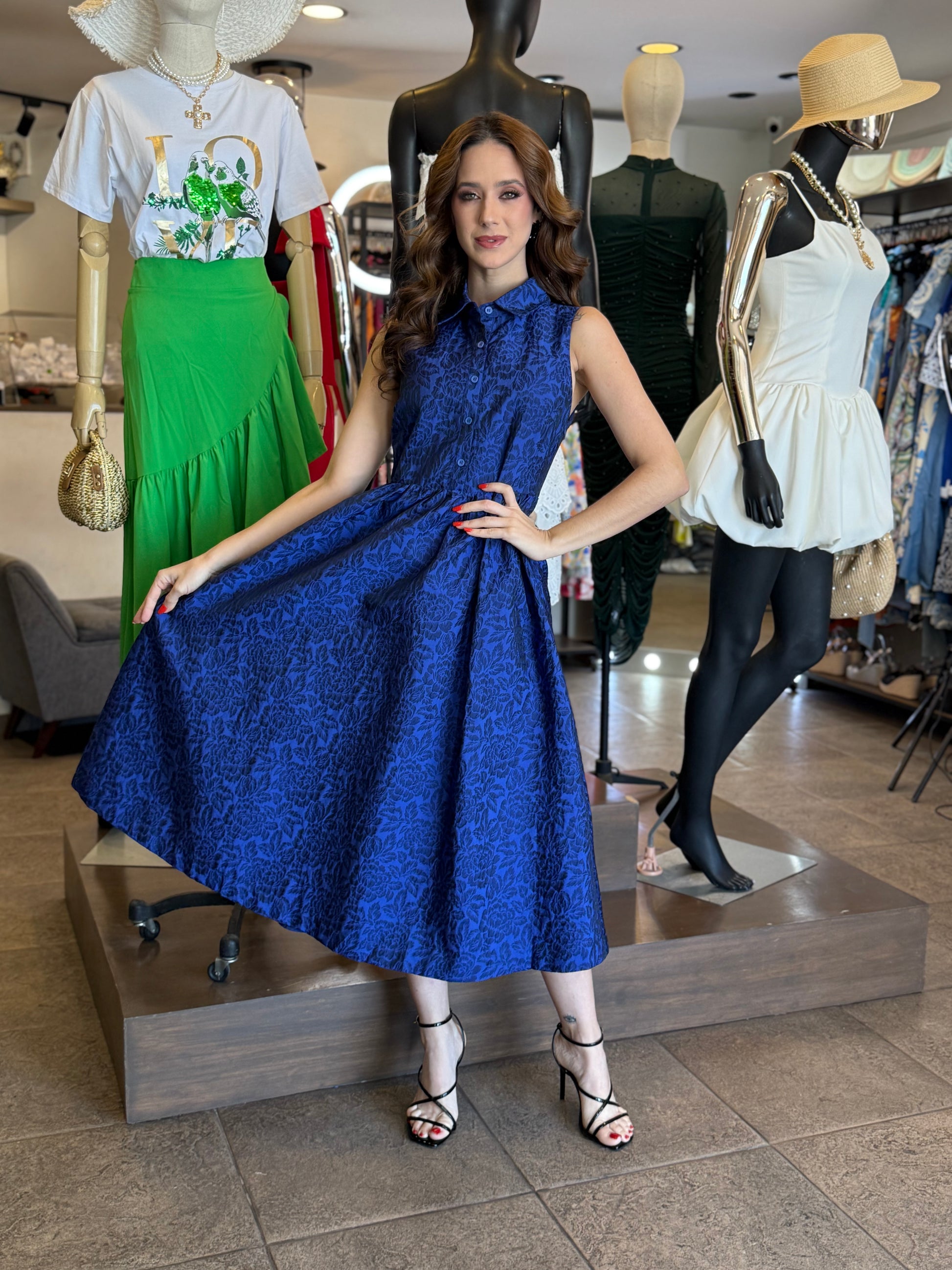 Este vestido en un profundo tono azul real es la mezcla perfecta entre frescura y distinción. Su diseño sin mangas y con cuello camisero añade un aire refinado, mientras que la falda amplia con vuelo aporta movimiento y feminidad. El estampado sutil en la misma tonalidad genera textura y elegancia, convirtiéndolo en una pieza versátil para destacar en cualquier ocasión.