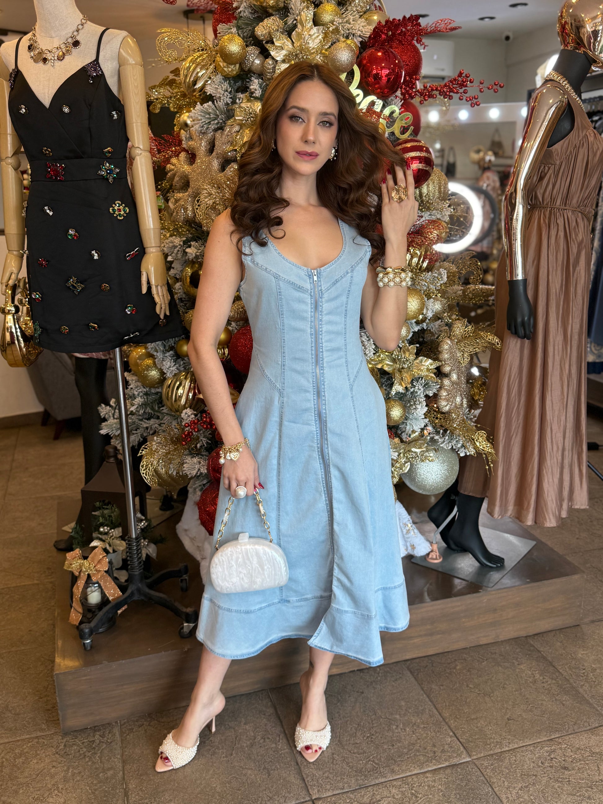 El Skyline Denim Muse Dress es ese vestido de mezclilla que se ve delicado, femenino y súper moderno. Confeccionado en denim ligero azul claro, abraza la parte superior del cuerpo con un corte tipo corsé y costuras visibles que estilizan la silueta, mientras que la falda midi se abre con un vuelo suave y muy favorecedor.