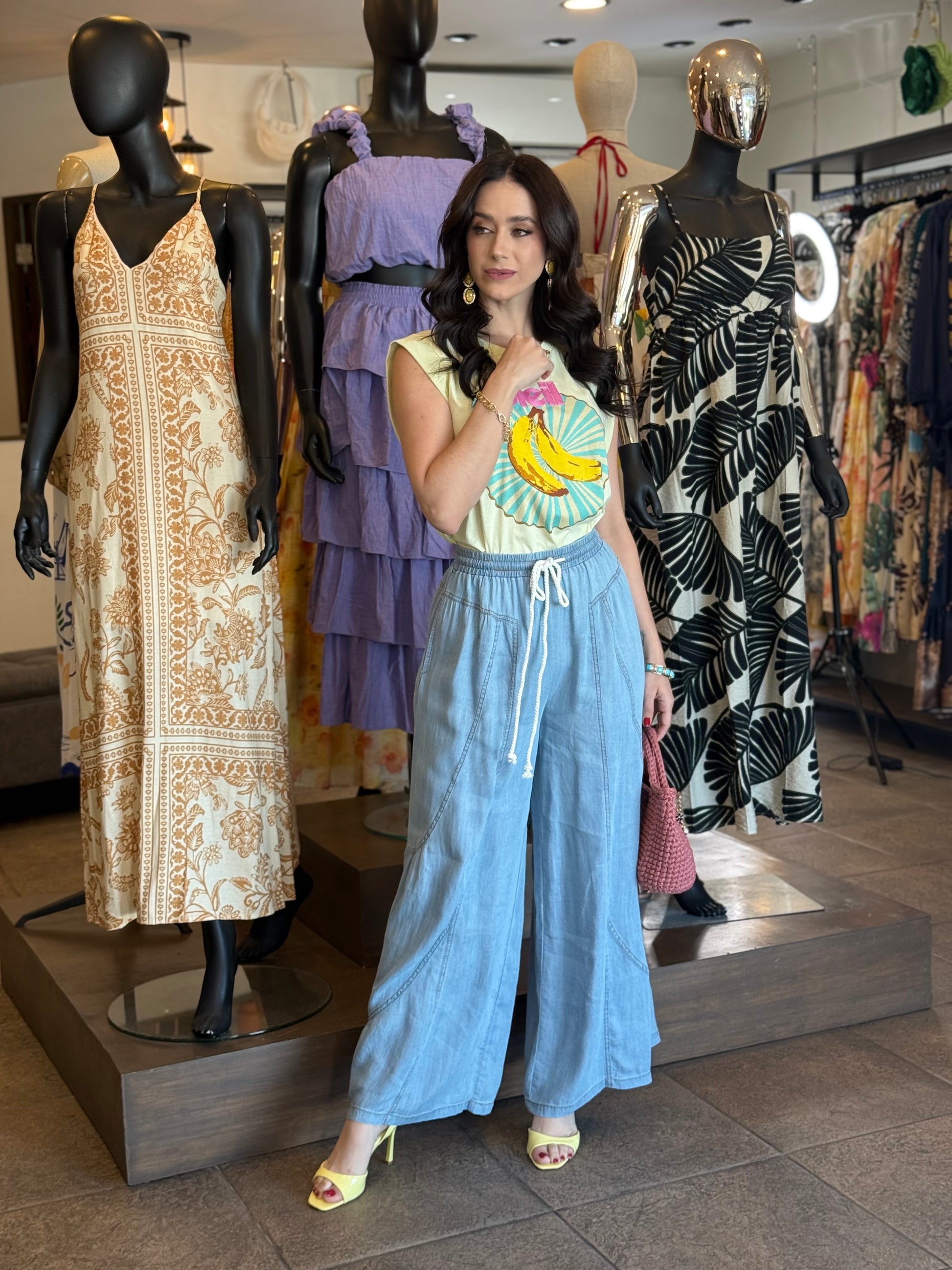 Un pantalón que redefine la comodidad con una silueta moderna y sofisticada. Confeccionado de caída suave, este diseño palazzo estiliza visualmente la figura gracias a su tiro alto y su amplitud fluida en pierna.