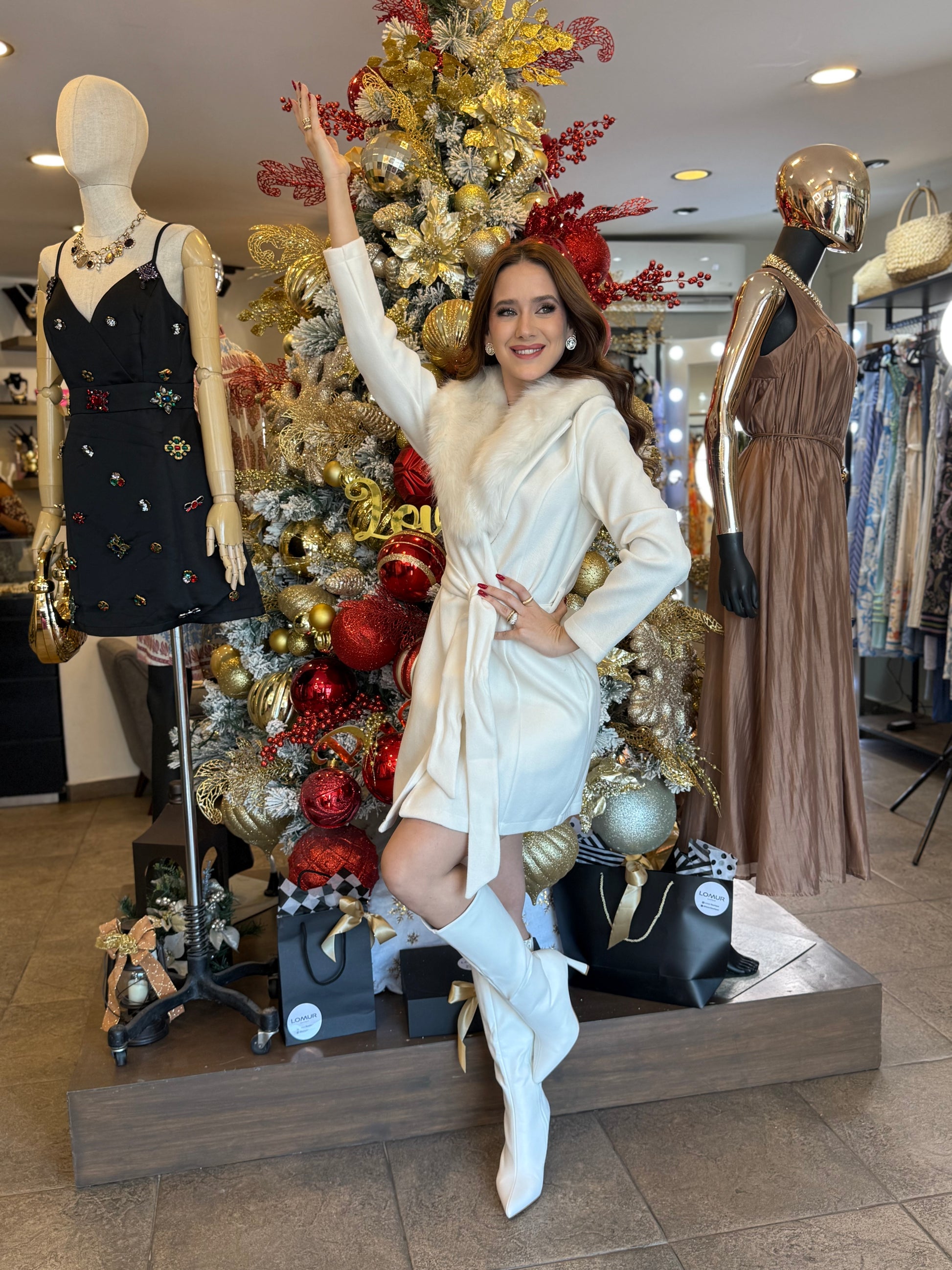 El detalle estrella es su cuello amplio con peluche sintético blanco, que enmarca el rostro y aporta un aire súper elegante y glam. Se cierra con un cinturón de la misma tela que define la cintura y permite ajustar la caída según tu gusto. Su largo mini deja ver las botas y estiliza las piernas
