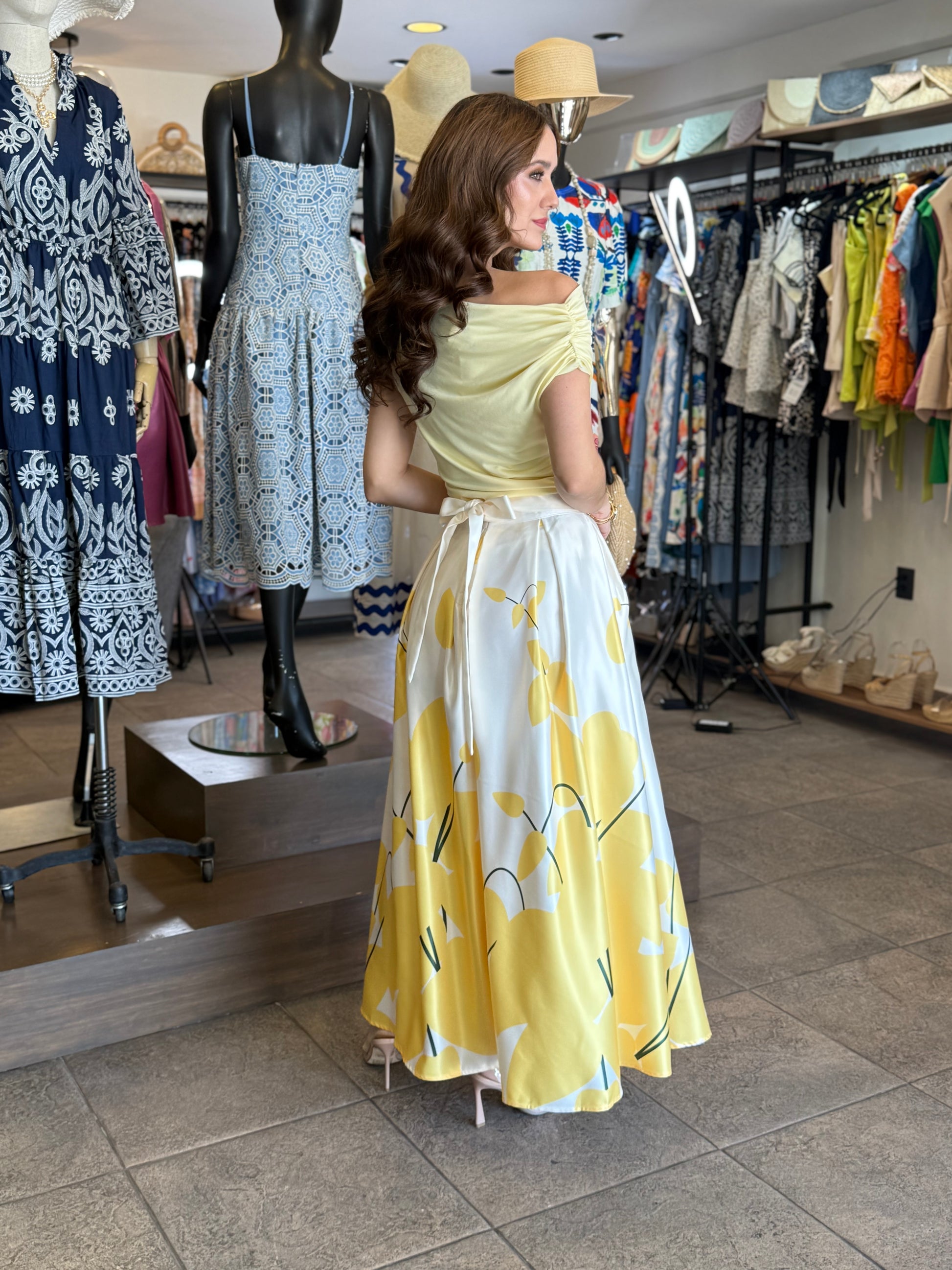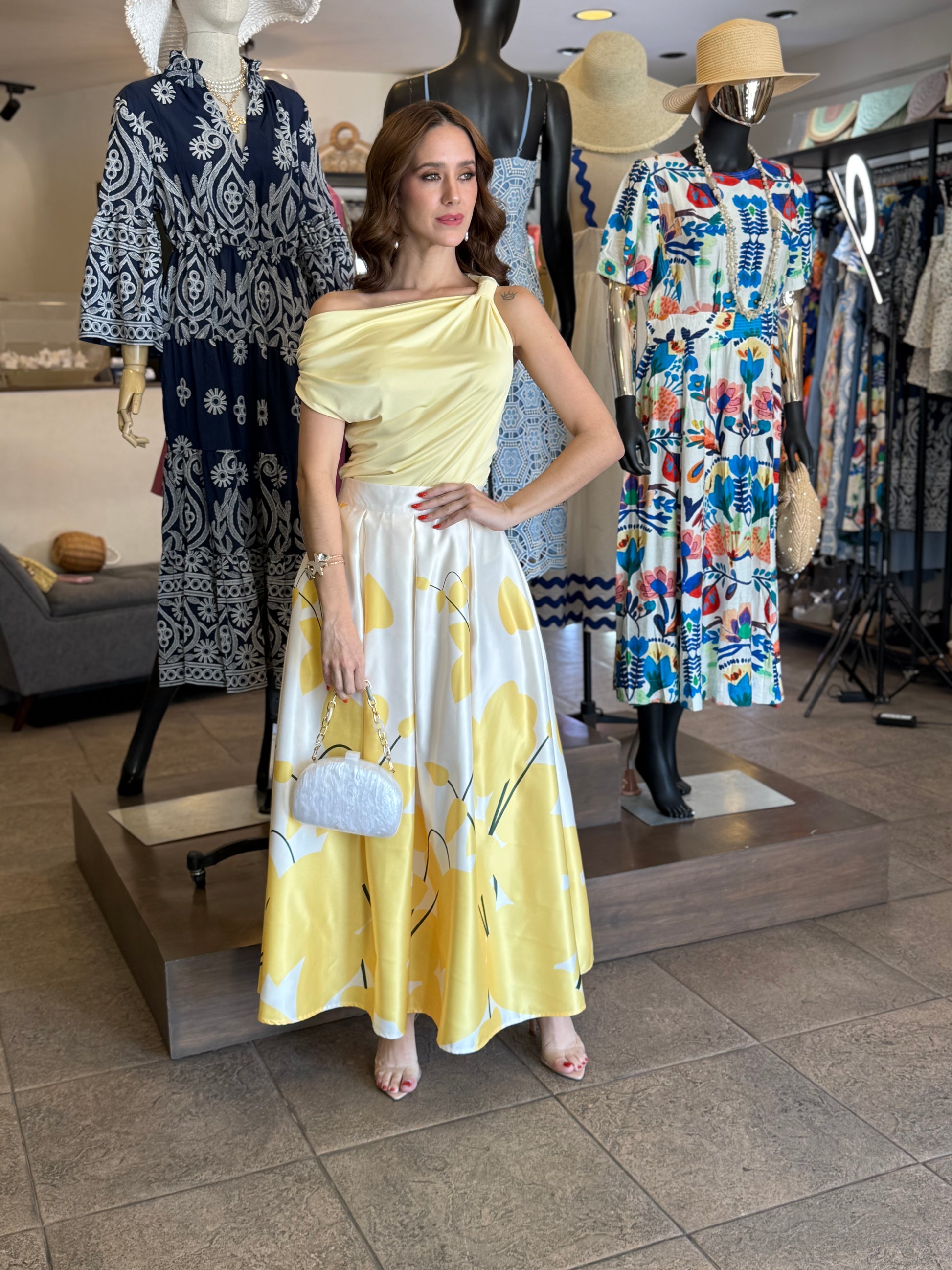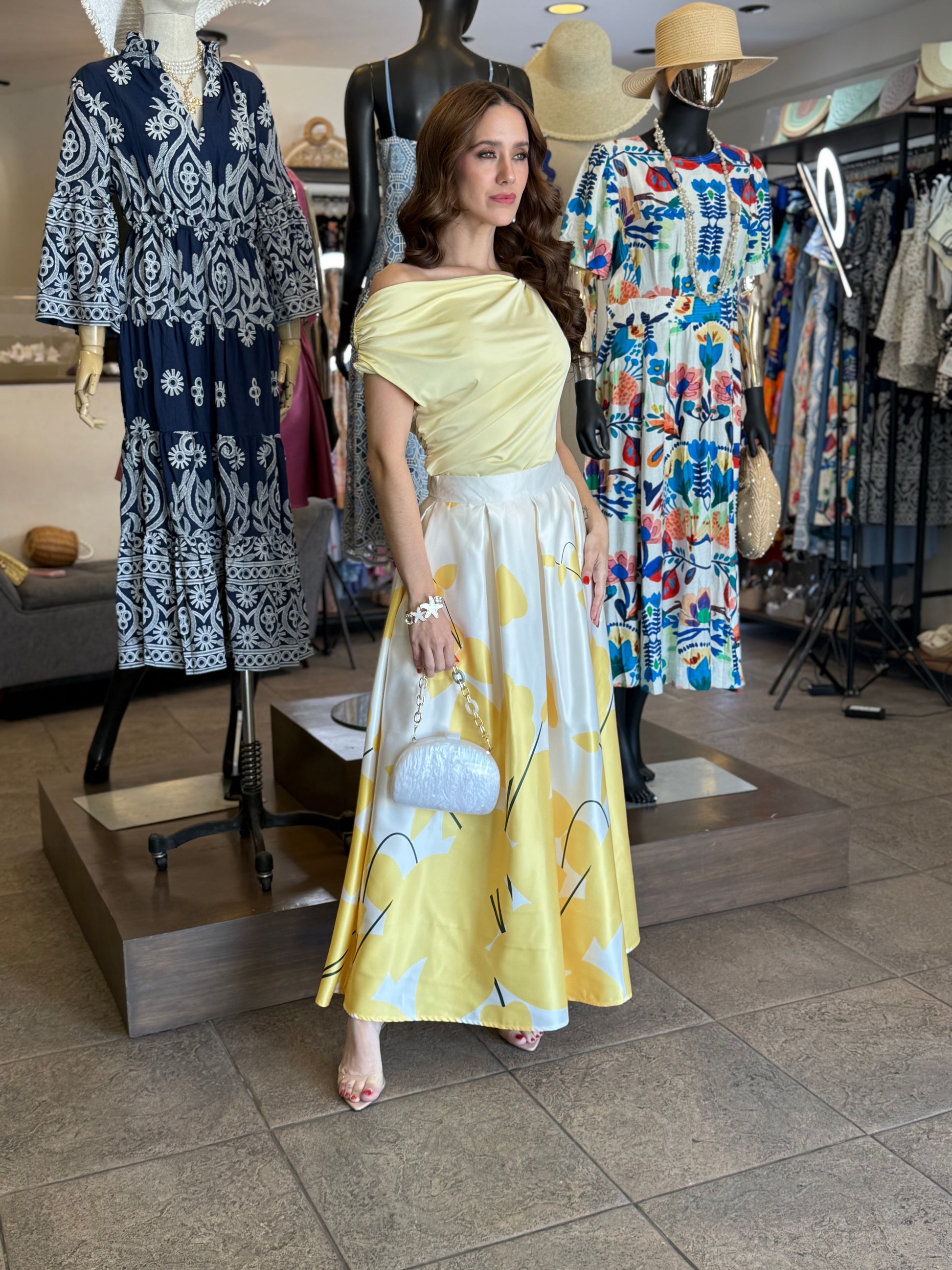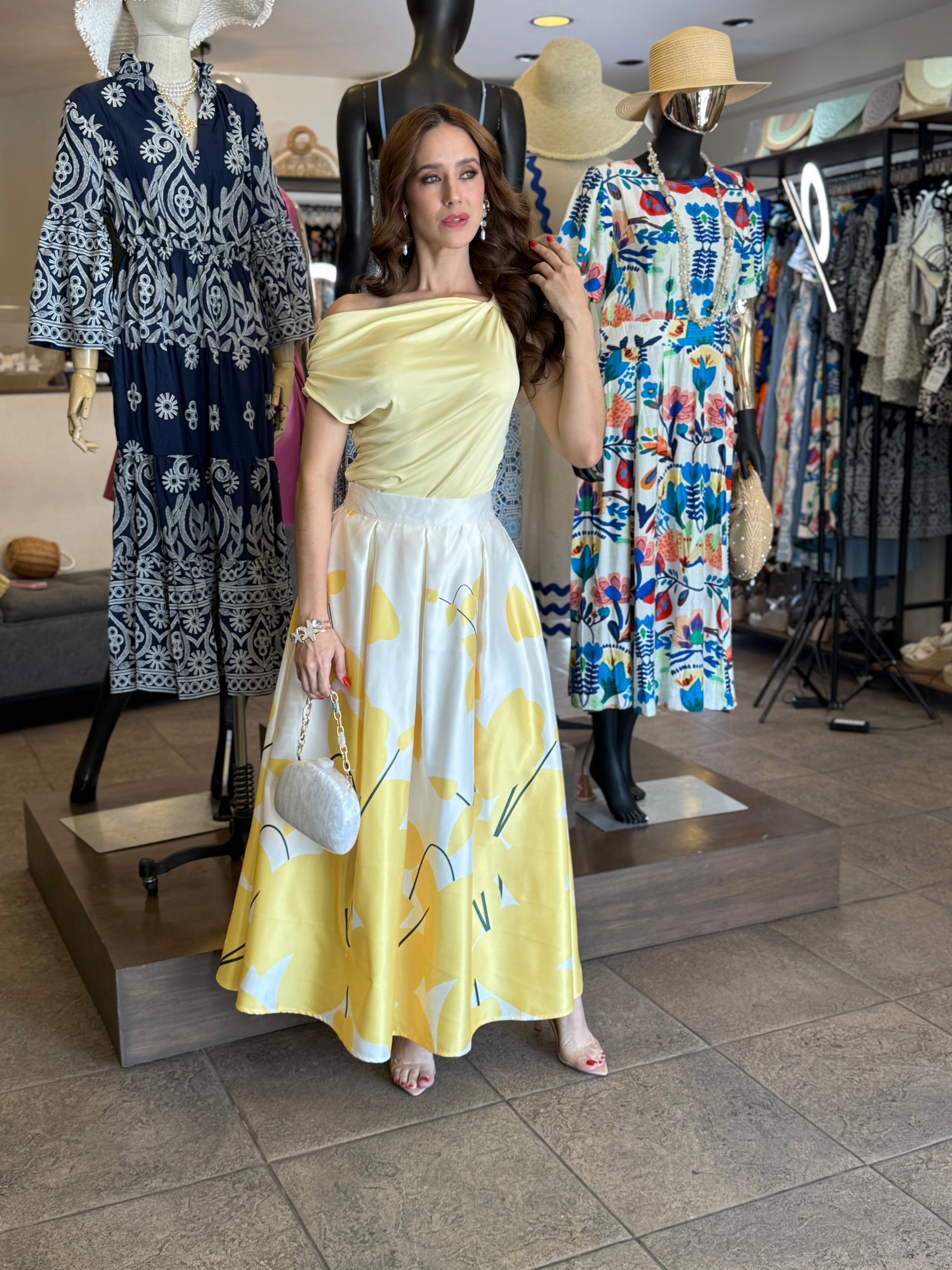 Un conjunto que refleja la frescura y la luminosidad de los días soleados. La blusa asimétrica en tono amarillo pastel, con caída elegante al hombro, aporta sofisticación y un toque moderno. La falda maxi de satín, con estampado floral en tonos amarillos y blancos, fluye con cada movimiento creando un aire etéreo y femenino.